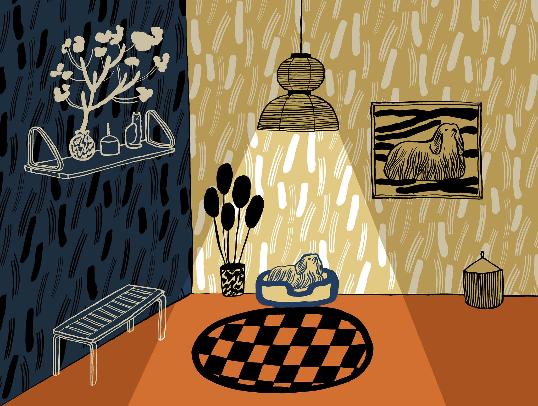 Illustration of design furniture and a dog alone at home.